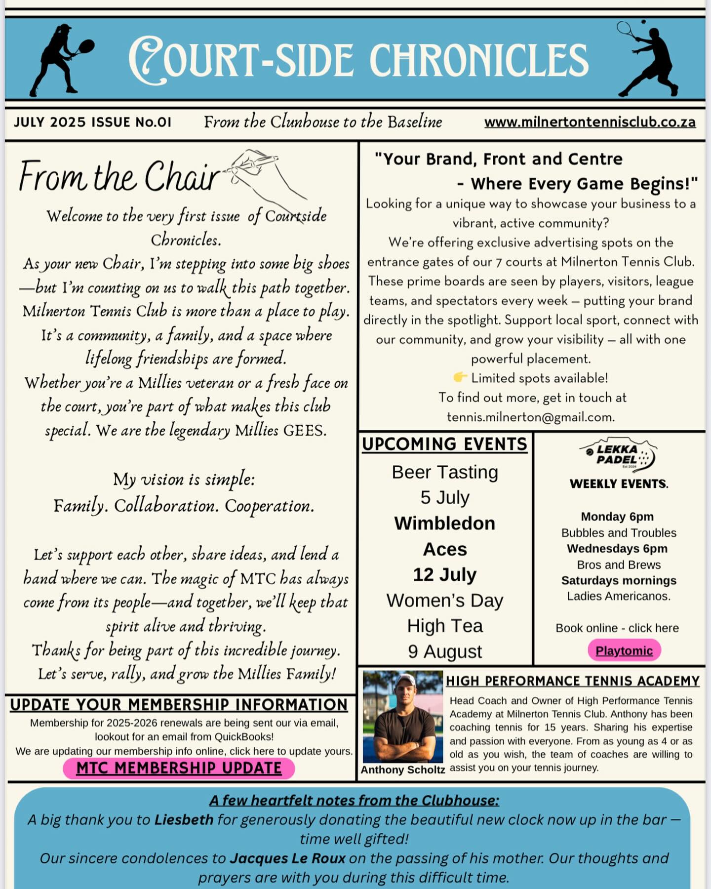 Today, Milnerton Tennis Club thrives as a vibrant center of activity. The club proudly supports Senior Men's and Ladies' League teams, actively competing in Western Province events. Tuesday and Thursday mornings are dedicated to social players, with evenings reserved for practice sessions for both social and league players. Saturdays are bustling with organised social tennis, welcoming players of all skill levels.